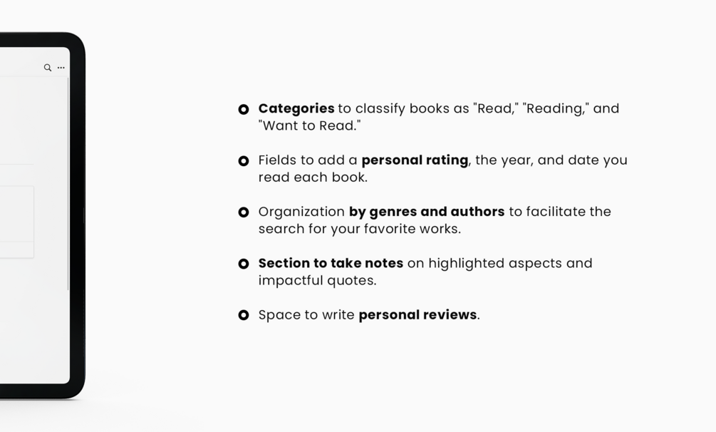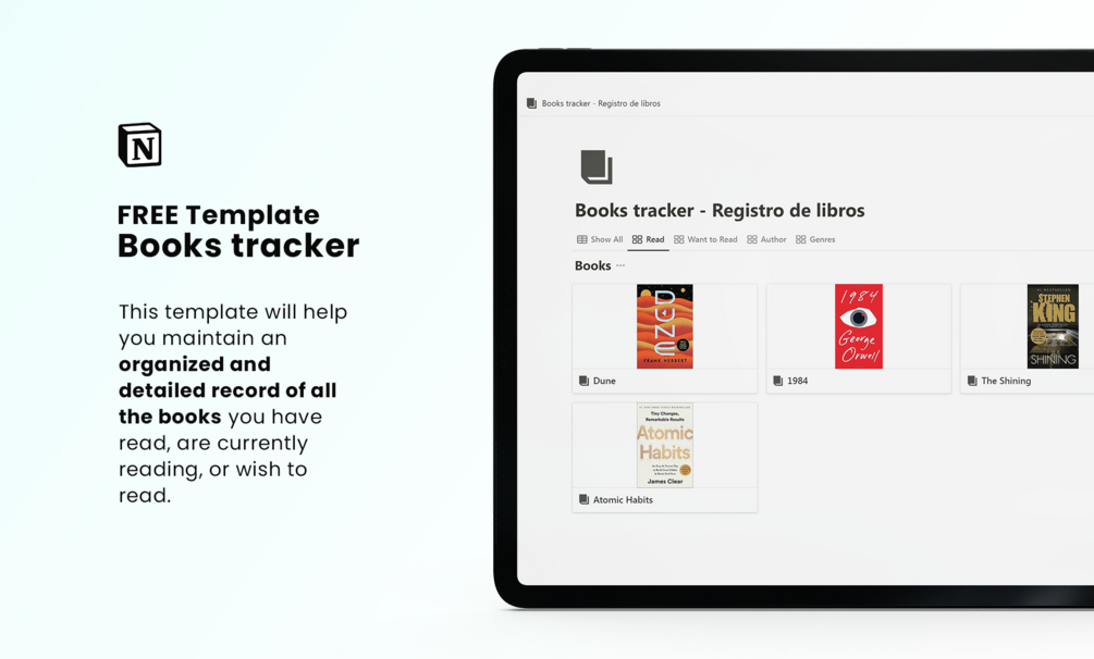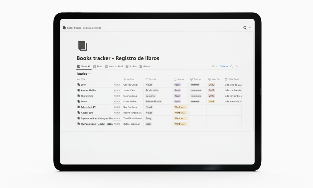 Este template te ayudará a mantener un registro organizado y detallado de todos los libros que has leído, estás leyendo o deseas leer. Con espacio para calificaciones, notas, reseñas y conclusiones personales, esta herramienta te permitirá reflexionar sobre tus lecturas y descubrir nuevas recomendaciones. El registro también está organizado por géneros y autores para facilitar el acceso y seguimiento de tus libros favoritos.