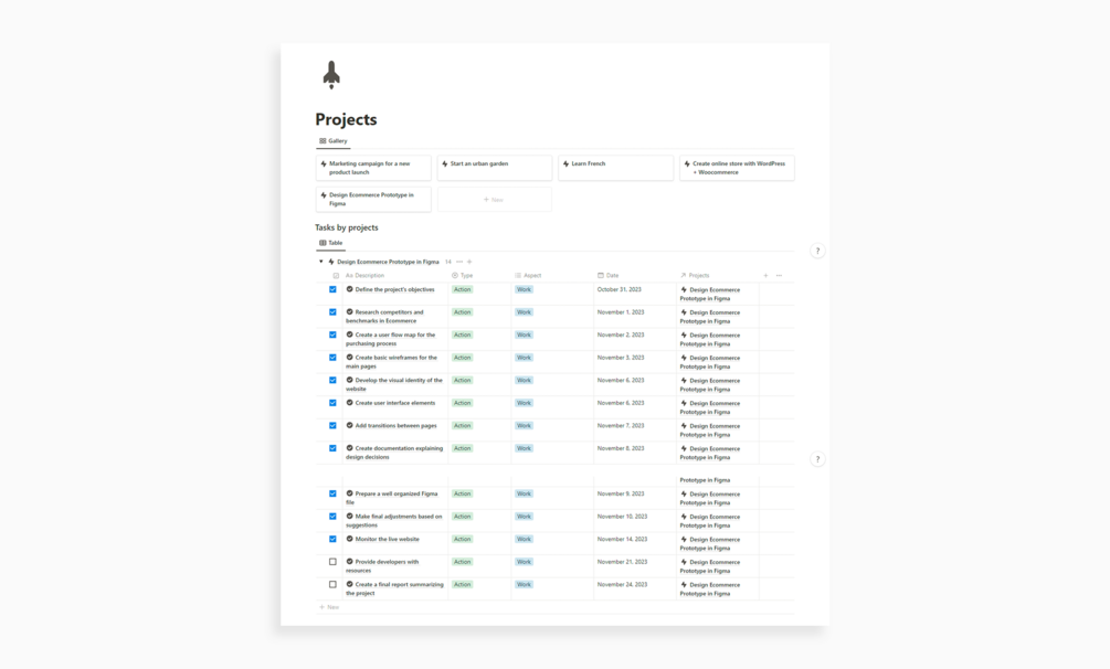 - Áreas de Enfoque: Clasifica tus proyectos según distintas áreas como Marketing, Entrenamiento, Manualidades, Cocina, Finanzas, etc.
