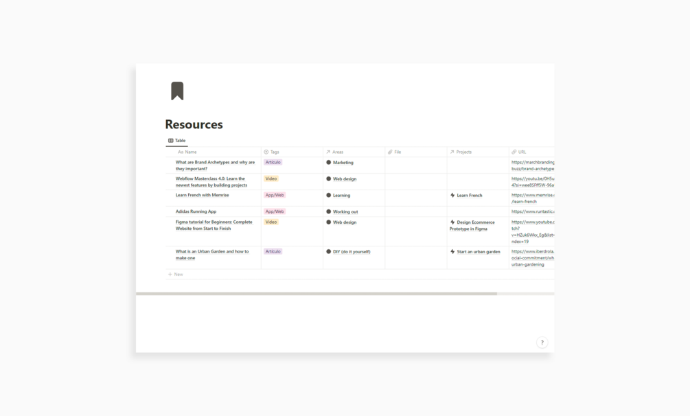 - Resources: Store videos, articles, websites, and other multimedia files relevant to your projects.